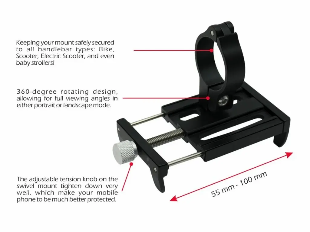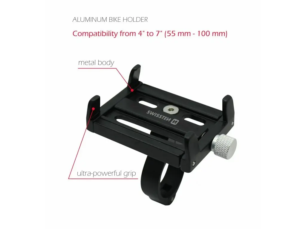 Odolný držák na mobil Swissten BC2 je určený na kolo, elektrokolo i skútr. Díky pevné konstrukci z hliníku udrží telefon bezpečně i při náročné jízdě.