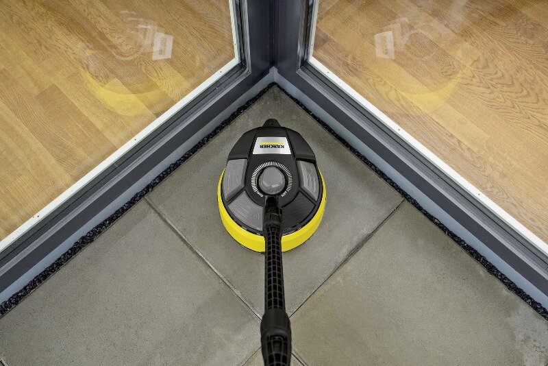 Přidání výkonové trysky také zaručuje účinné čištění v rozích a na okrajích. Díky integrované oplachovací trysce se uvolněné nečistoty jednoduše zbaví vyčištěného povrchu - ušetří se tak čas a úsilí. Tvrdé povrchy, jako je kámen a beton, a jemnější povrchy, jako je dřevo, lze vyčistit úpravou vzdálenosti mezi tryskou a povrchem, který má být čištěn.