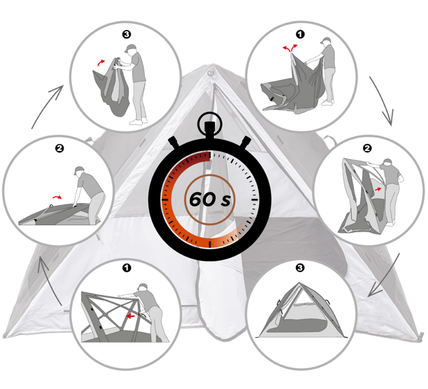 Celý princip postavení stanu je v zatažení za úchyt umístěný na bočnicích, při vytažení úchytů na obou stranách se vám konstrukce sama vypne.