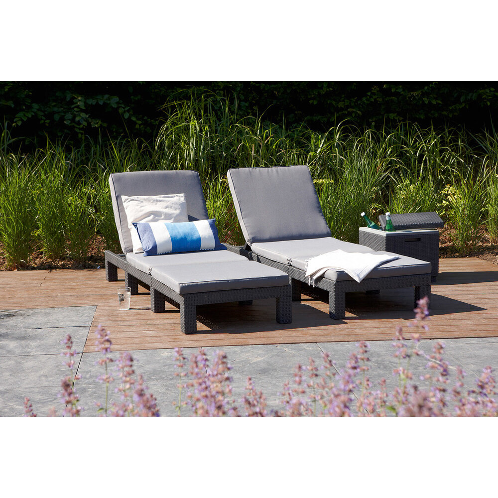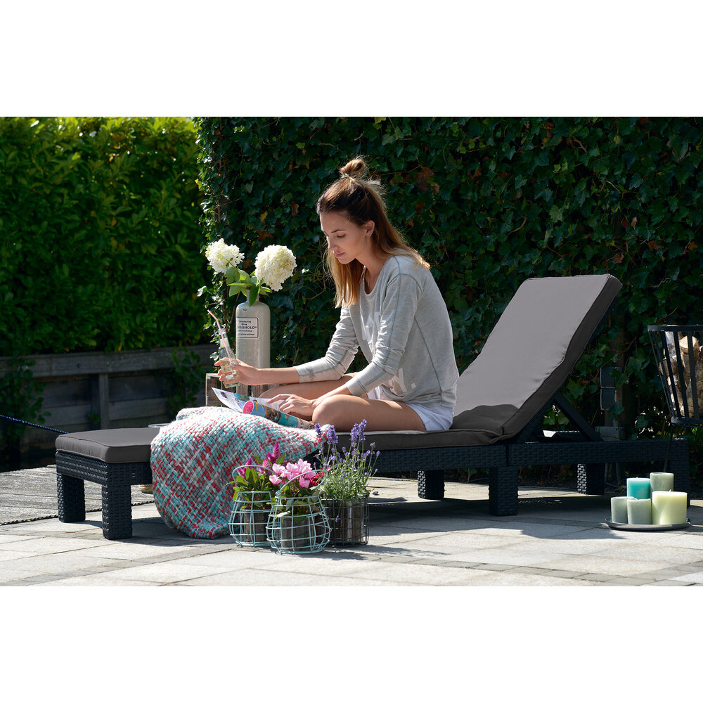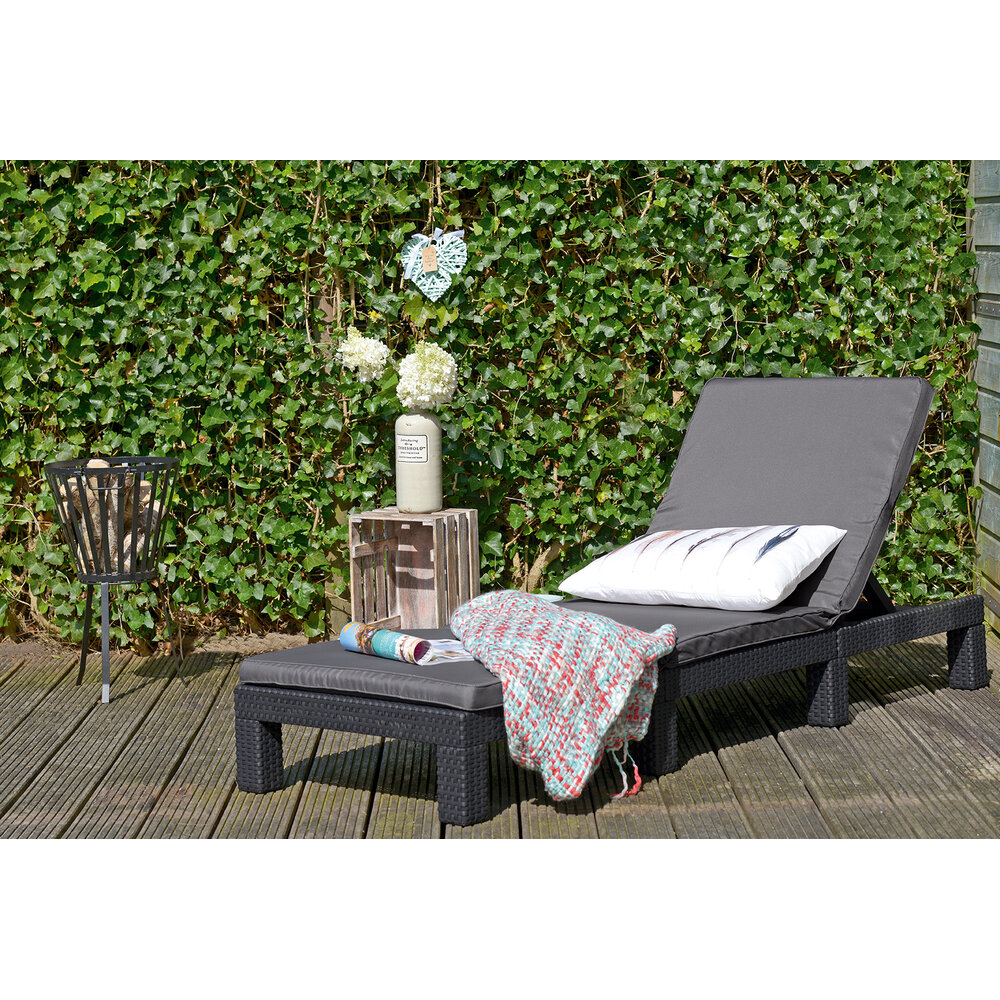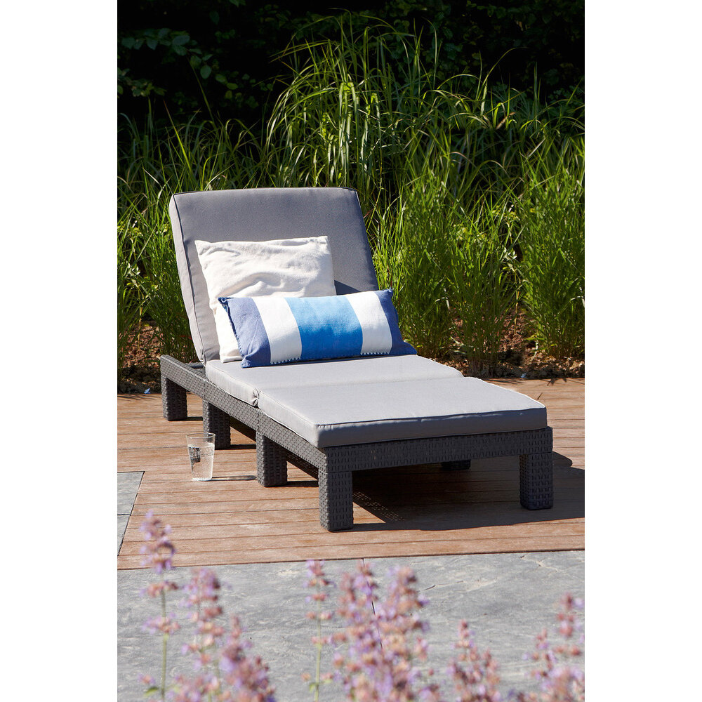 Lehátko v barvě grafitu s polohováním zad je opatřeno šedohnědými polstry. Zahradní lehátko je vyrobené z kvalitního polyratanu, který odolává UV záření i nepřízni počasí.
