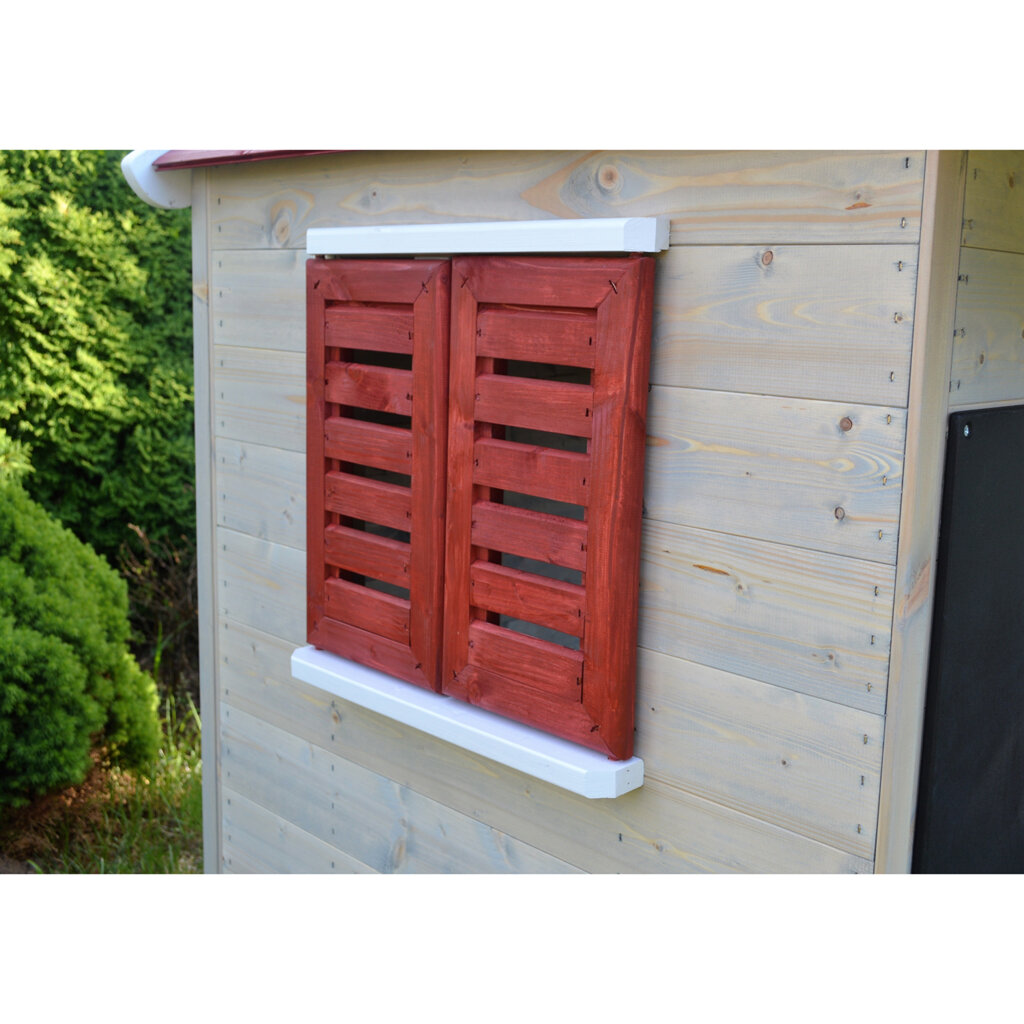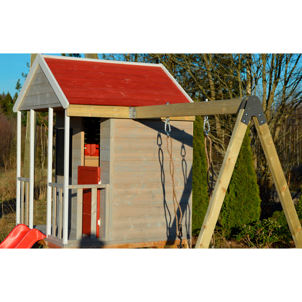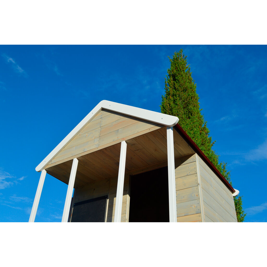 Domeček "Veranda" je na vyvýšené podestě, má podlahu a zastřešenou verandu. Radost dětem udělá nejen tabule, která je vhodná pro psaní a malování, ale i skluzavka, houpačka s nastavitelným sedátkem a pískoviště se 4-mi sedátky.