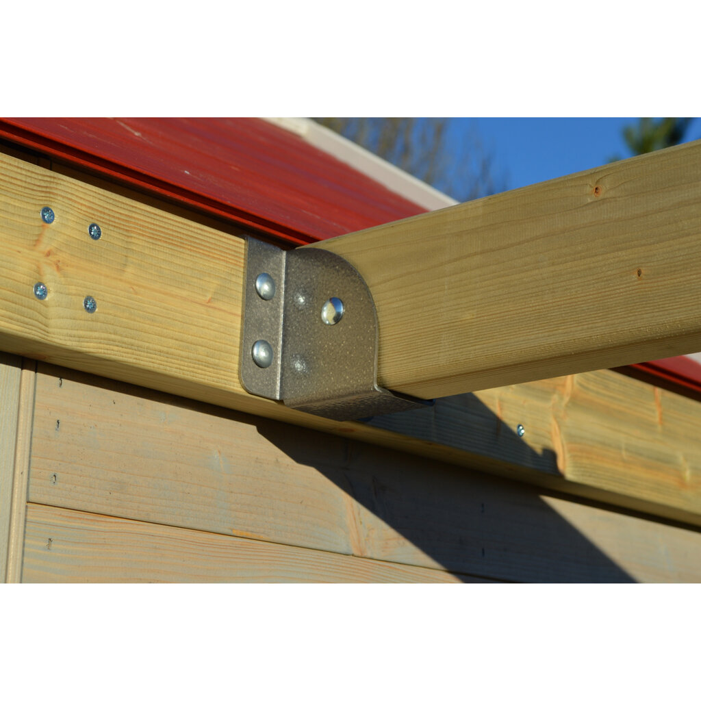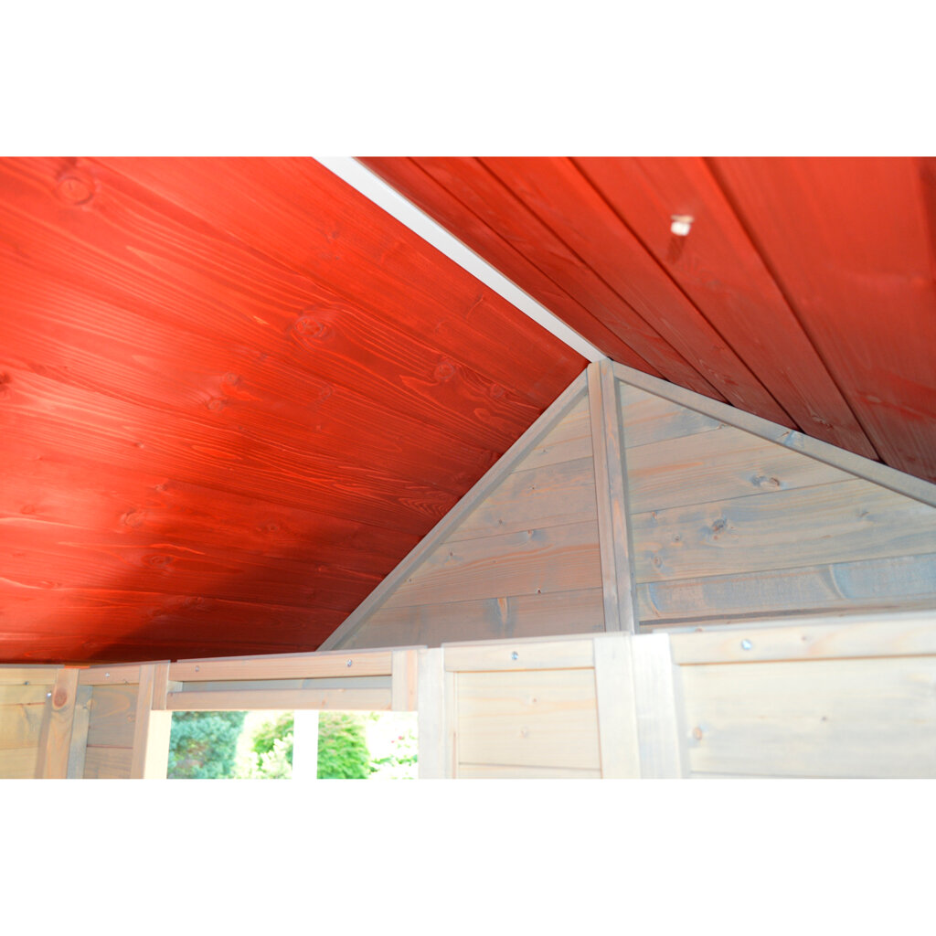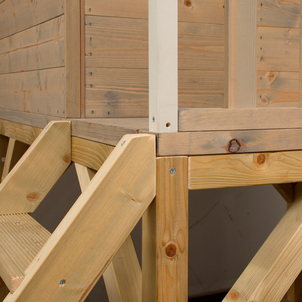 Domeček "Veranda" je na vyvýšené podestě, má podlahu a zastřešenou verandu. Radost dětem udělá nejen tabule, která je vhodná pro psaní a malování, ale i skluzavka, houpačka s nastavitelným sedátkem a pískoviště se 4-mi sedátky.