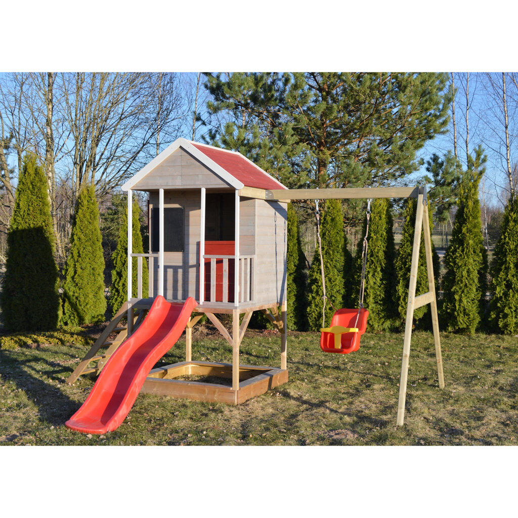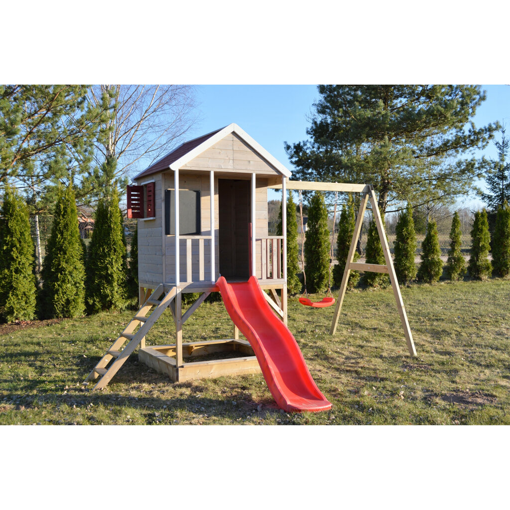 Zahradní hrací sestava pro děti vyrobená ze dřeva severského smrku. Kromě domku má i houpačku, skluzavku, pískoviště a tabuli na kreslení.