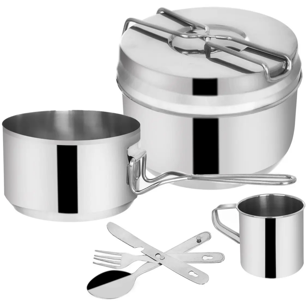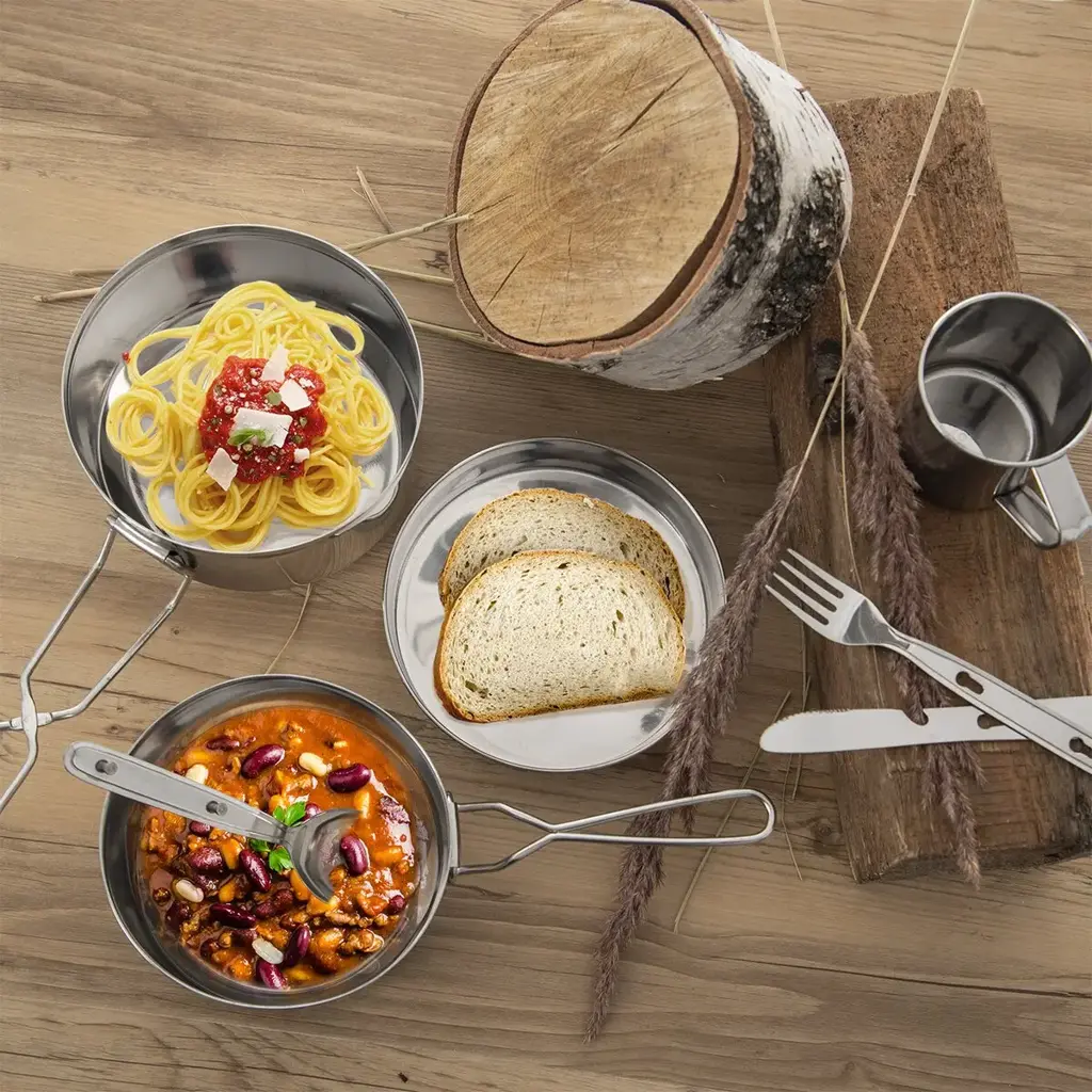 Sedmidílná kempingová sada z nerezové oceli obsahuje dva hrnce s víčkem, hrnek a příbor se zámkovým systémem. Vše lze složit do jednoho kompaktního celku, který šetří místo v batohu a je ideální na táboření i kempování.