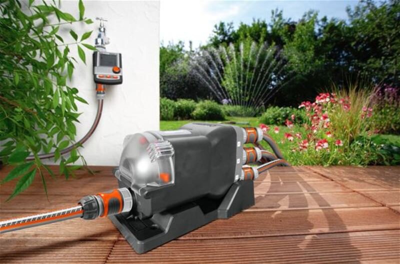 V kombinaci se zavlažovacím počítačem GARDENA MasterControl nebo MasterControl solar (č.v. 1864, 1866), GARDENA rozdělovač vody automatic zajišťuje automatické zavlažování až šesti různých oblastí zahrady, jednu po druhé. Například můžete zavlažovat trávník zavlažovačem, pak hrnkové rostliny, záhonky, živé ploty a truhlíky pomocí systému kapkové závlahy. Průtok vody automaticky otevře výstupy, jeden po druhém, v závislosti na naprogramování zavlažovacího počítače. Praktické: rozdělovač vody lze pružně přizpůsobit podmínkám ve vaší zahradě. To znamená, že můžete zavlažovat buď pouze dvě oblasti nebo až šest. Nepotřebné výstupy vody se jednoduše deaktivují pomocí páčky. Stejně jako různé rostliny v zahradě potřebují různé množství vody, lze také individuálně nastavit dobu zavlažování v závislosti na naprogramování zavlažovacího počítače. Rozdělovač vody dopraví požadované množství na správné místo. Toto inteligentní řešení je ideální, když není k dispozici dostatečné množství vody pro současné napájení všech koncových přístrojů. Jednoduše připojíte rozdělovač vody na zeď domu, nebo na zem. Protože jsou všechny vývody vody umístěny v jednom směru, zařízení zabírá velmi málo místa. Je vybaven vnějším závitem 26,5 mm (G ¾) a je dodáván s pěti ks šroubení ( č.v. 901) a třemi koncovými zátkami.