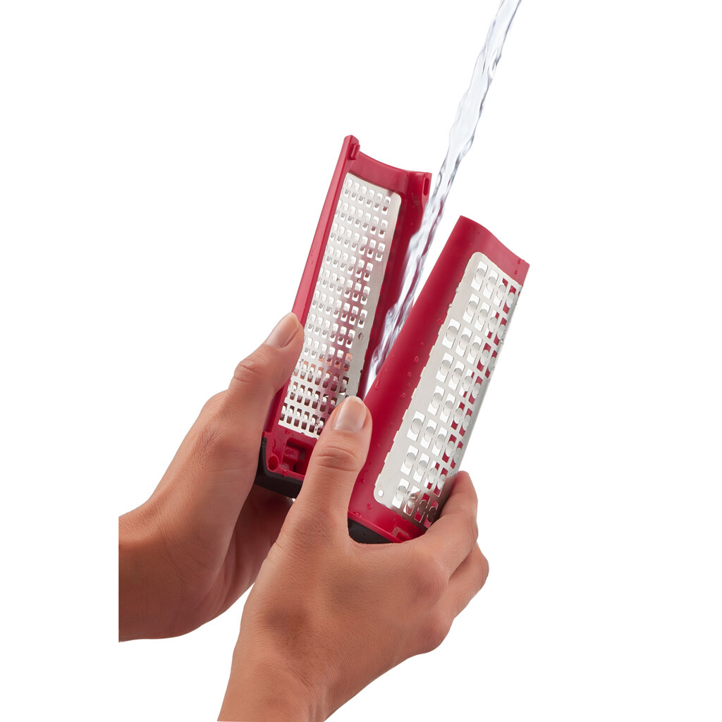 Jak sýr, tak třeba mrkev či citronovou kůru nastrouhá toto struhadlo z řady Ingenio za pár okamžiků. Jeho devízou je integrovaný zásobník, který usnadňuje práci a zaručuje čistotu pracovního prostoru. V červené části struhadla jsou z obou stran zabudované nerezové nože, které dovolují strouhat buď na jemno nebo na hrubo. Rukojeť s měkkým povrchem zajistí pohodlné držení struhadla a jistější úchop. Struhadlo je vysoce odolné proti kyselinám a zbarvení a neobsahuje škodlivé BPA ani ftaláty, díky čemuž i ochrání přirozenou chuť potravin. Oboustranné struhadlo je plně rozebiratelné na jednotlivé části, a proto se snadno čistí. Můžete ho také umýt v myčce.