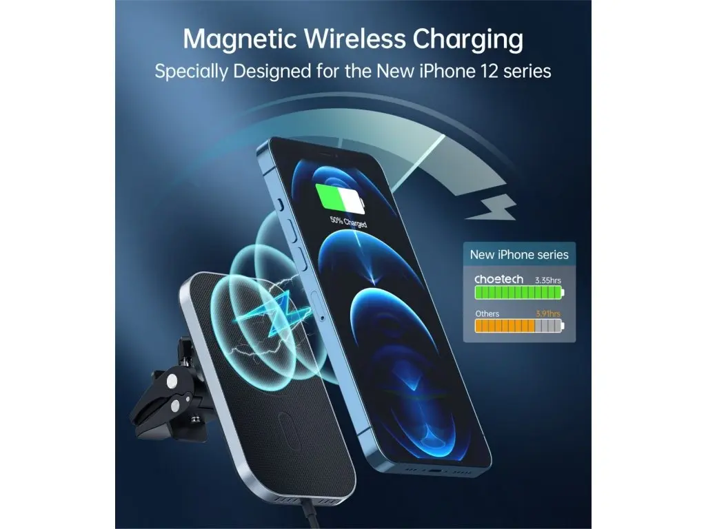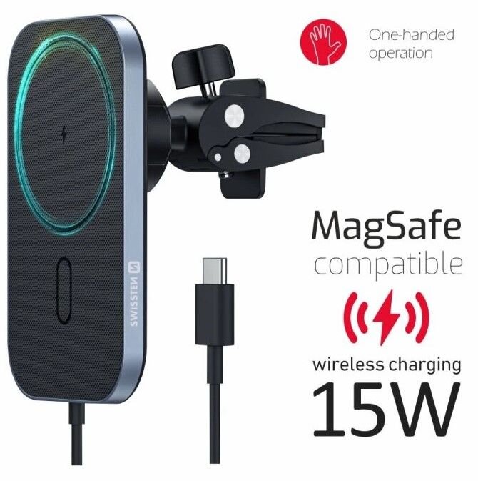 Magnetický držák Swissten MagSafe s bezdrátovým nabíjením 15 W nabízí pohodlné uchycení telefonu do ventilace a efektivní dobíjení. Kompatibilní s iPhony 12 a novějšími a technologií Qi.