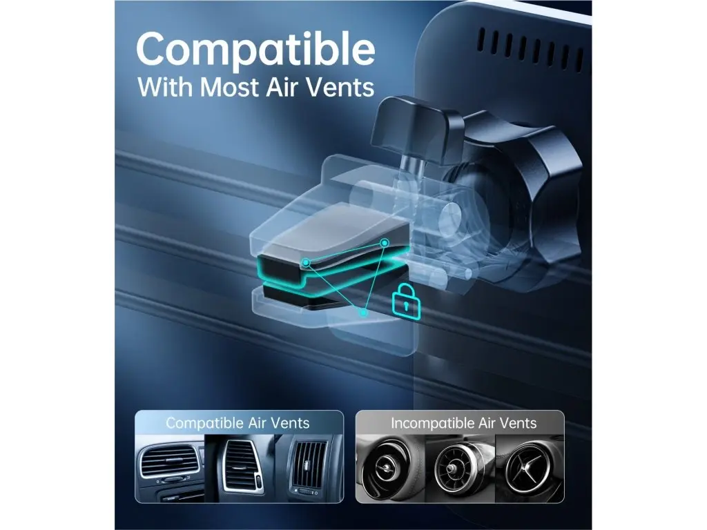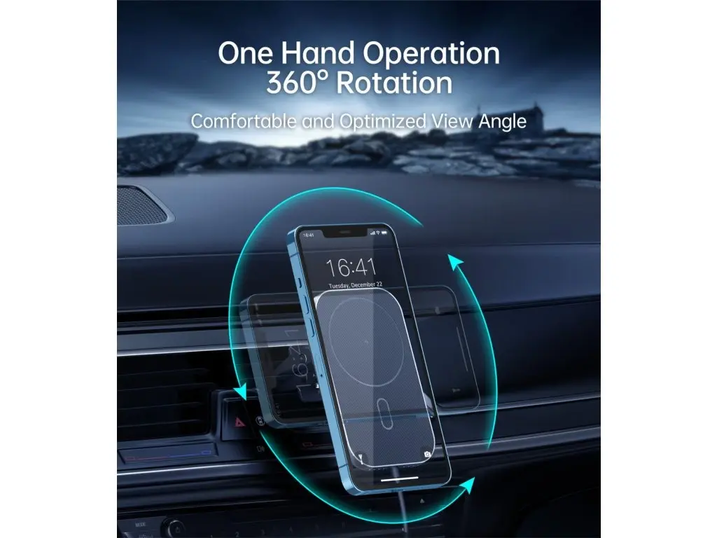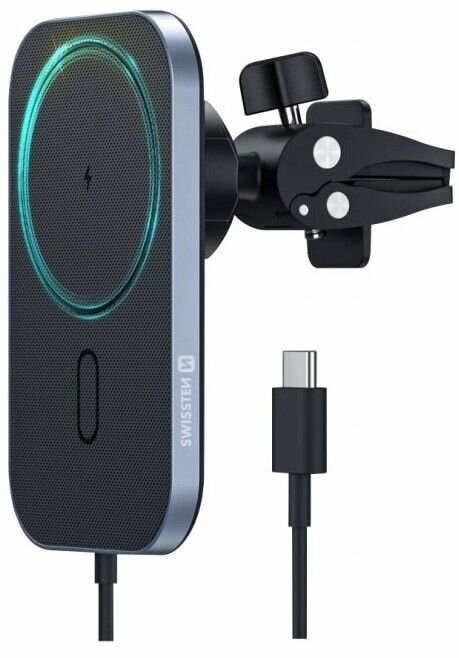 Magnetický držák na mobil Swissten s technologií MagSafe umožňuje bezpečné uchycení telefonu do ventilace a zároveň jeho bezdrátové nabíjení s výkonem až 15 W. Pogumované čelisti chrání větrací mřížku před poškozením a integrovaný USB-C kabel zajišťuje pohodlné zapojení. Díky možnosti otáčení o 360° a snadnému ovládání jednou rukou je ideální volbou pro každodenní použití. Držák je kompatibilní s iPhony od modelu 12 výše a s bezdrátovým nabíjením Qi.