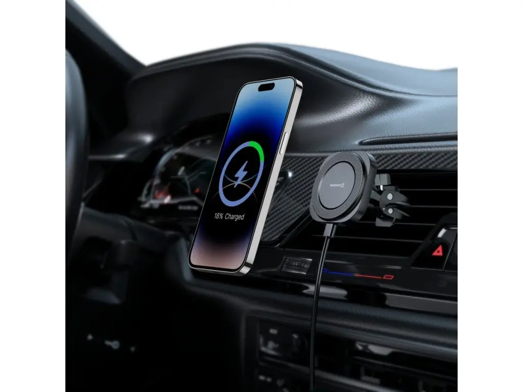 Magnetický držák Swissten Magstick nabízí pohodlné a bezpečné uchycení telefonu ve ventilační mřížce spolu s bezdrátovým nabíjením až 15 W. Je kompatibilní s technologií MagSafe i Qi a vhodný pro iPhone i Samsung zařízení.