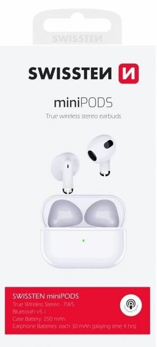 Bezdrátová sluchátka Swissten Minipods jsou ideálním řešením pro každého, kdo hledá pohodlný a kvalitní poslech hudby bez kabelů. Díky technologii True Wireless (TWS) a lehké konstrukci sluchátka skvěle padnou a jsou téměř neznatelná. Nabízejí kvalitní zvuk, snadné ovládání přímo na sluchátkách a možnost hands-free telefonování. Tento model, známý také jako bezdrátová sluchátka s mikrofonem, je vhodný pro každodenní používání i sport.