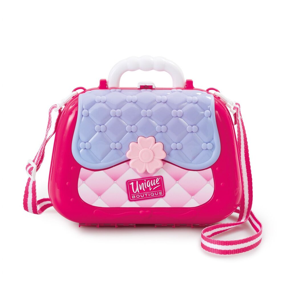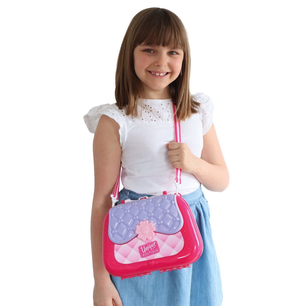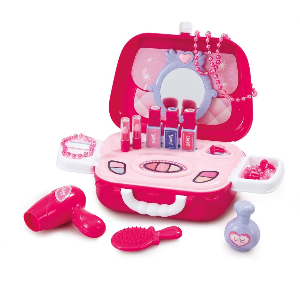Pomocí předstíraného make-upu můžete hrát, že nanášíte oční stíny, rtěnky a tvářenky. Vysušte a vykartáčujte si vlasy, nasaďte si náhrdelník, náramek a navlékněte prsteny. Poté svůj vzhled zakončete parfémem. Všechny kousky jsou napodobeniny. Toto roztomilé pouzdro je skvělé pro dobrodružství na cestách nebo ideální pro domácí hýčkání.