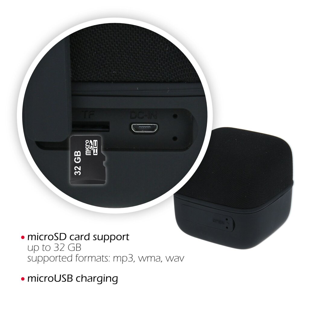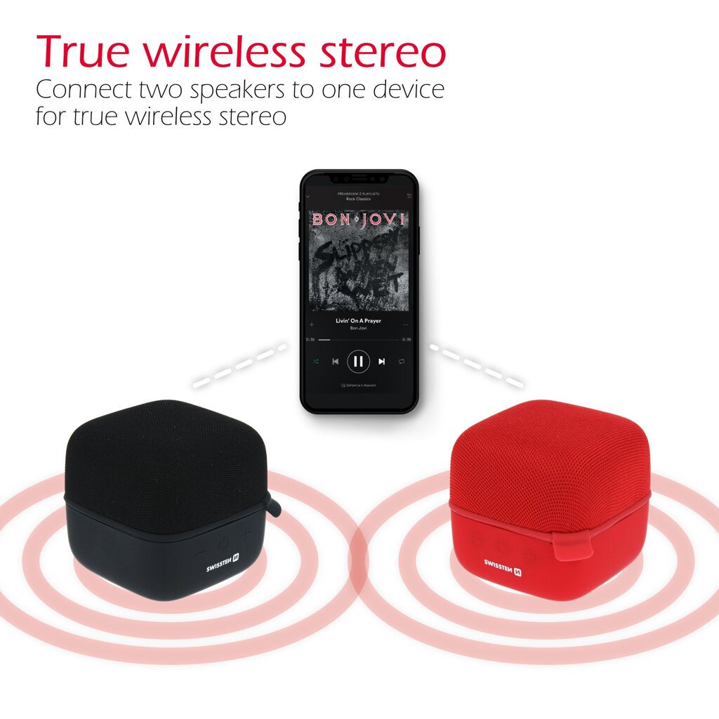 Kompaktní Bluetooth reproduktor Swissten Music Cube nabízí výkon 10 W a možnost vytvoření stereo efektu díky funkci True Wireless. Podporuje přehrávání z Bluetooth, microSD i AUX a je vhodný i pro handsfree volání.