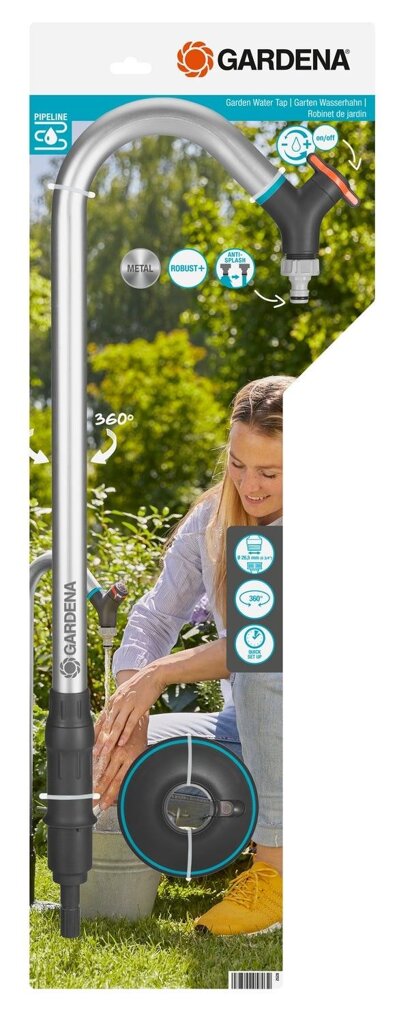 Zahradní vodovodní kohoutek značky GARDENA přidává do vašeho systému Pipeline praktický vodovodní kohoutek. Venkovní vodovodní kohoutek nainstalujete bez dalších nástrojů na vodní zásuvku Pipeline v několika jednoduchých krocích a je okamžitě připraven k použití. Obsluha je snadná a nabízí vám praktické funkce. Začíná to pohodlnou výškou vodovodního kohoutku, což usnadňuje jeho používání. Vodovodní kohoutek můžete flexibilně otáčet ve všech směrech a pomocí regulačního ventilu nastavit průtok vody. Vypnutí vody je možné pomocí ventilu. Díky funkci Anti-Splash se kbelíky a konve plní bez rozstřikování vody, i v případě, že jste nepřipojili hadici. Na výrobu zahradního vodovodního kohoutku byly použity velmi kvalitní a trvanlivé materiály. Trubka je vyrobena z hliníku, díky čemu je kohoutek velmi pevný. Vysoká kvalita výrobků je zaručena jejich výrobou v Německu. Voda všude tam, kde je potřebná. Snadný přístup k vodě: potrubí vedené pod zemí.
