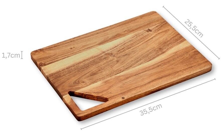 Univerzální prkénko na krájení a servírování z kvalitního akáciového dřeva je praktickým doplňkem do každé kuchyně. Díky optimálním rozměrům poskytuje dostatek prostoru pro přípravu pokrmů a zároveň může sloužit jako elegantní servírovací deska. Přírodní materiál s certifikací FSC 100 % zaručuje ekologicky šetrný výrobek, který je zároveň šetrný k ostří nožů. Kvalitní zpracování a pevná konstrukce zajistí dlouhou životnost při každodenním používání.