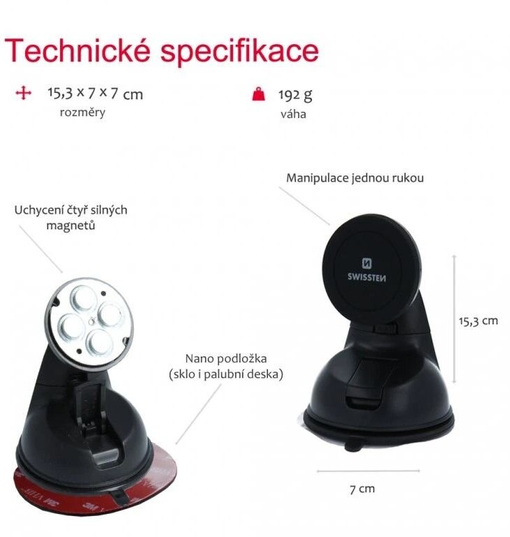 Univerzální magnetický držák na telefon Swissten S-Grip M1 s přísavkou, otočným kloubem a čtyřmi kovovými plíšky. Vhodný pro většinu telefonů a snadné upevnění na sklo i palubní desku.