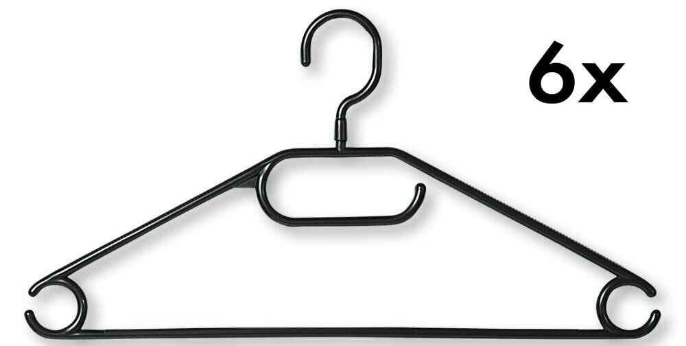 Sada 6 plastových ramínek v černé barvě je ideální pro každodenní použití v domácnosti. Ramínka jsou vybavena otočným háčkem, háčky na oblečení a tyčí na kalhoty.