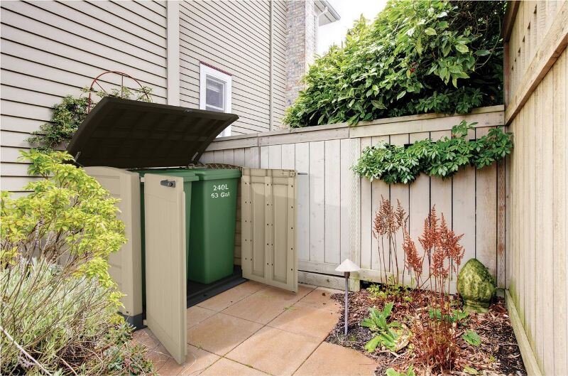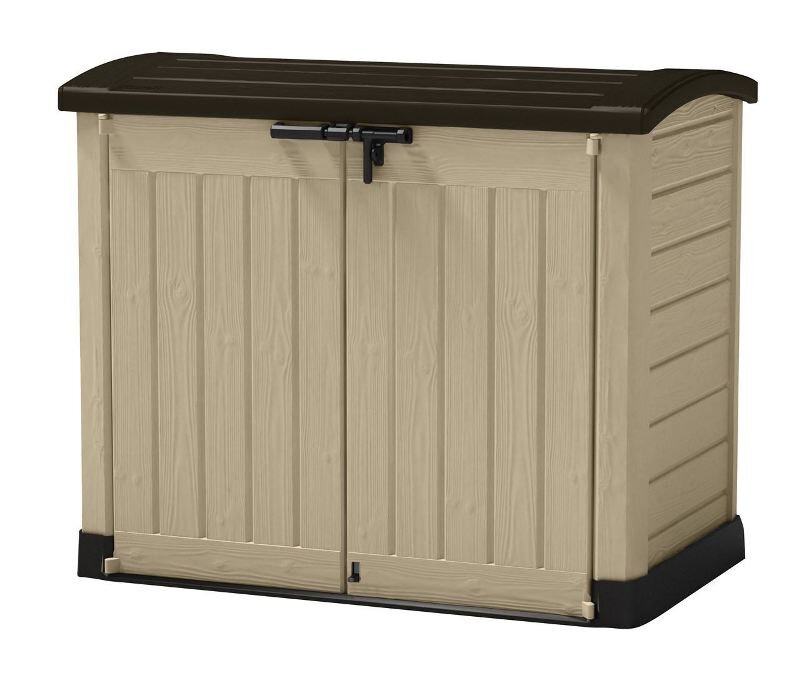 Úložná skříňka Store It Out ARC se vyznačuje elegantním designem s texturou připomínající přírodní dřevo. Díky možnosti instalace vnitřní police je velmi funkční a přizpůsobitelná různým potřebám. Je ideální pro uložení zahradních doplňků, nářadí nebo dvou velkých popelnic o objemu 240 l. Odolná plastová konstrukce chrání uložené předměty před vlhkostí a zajišťuje dlouhou životnost.