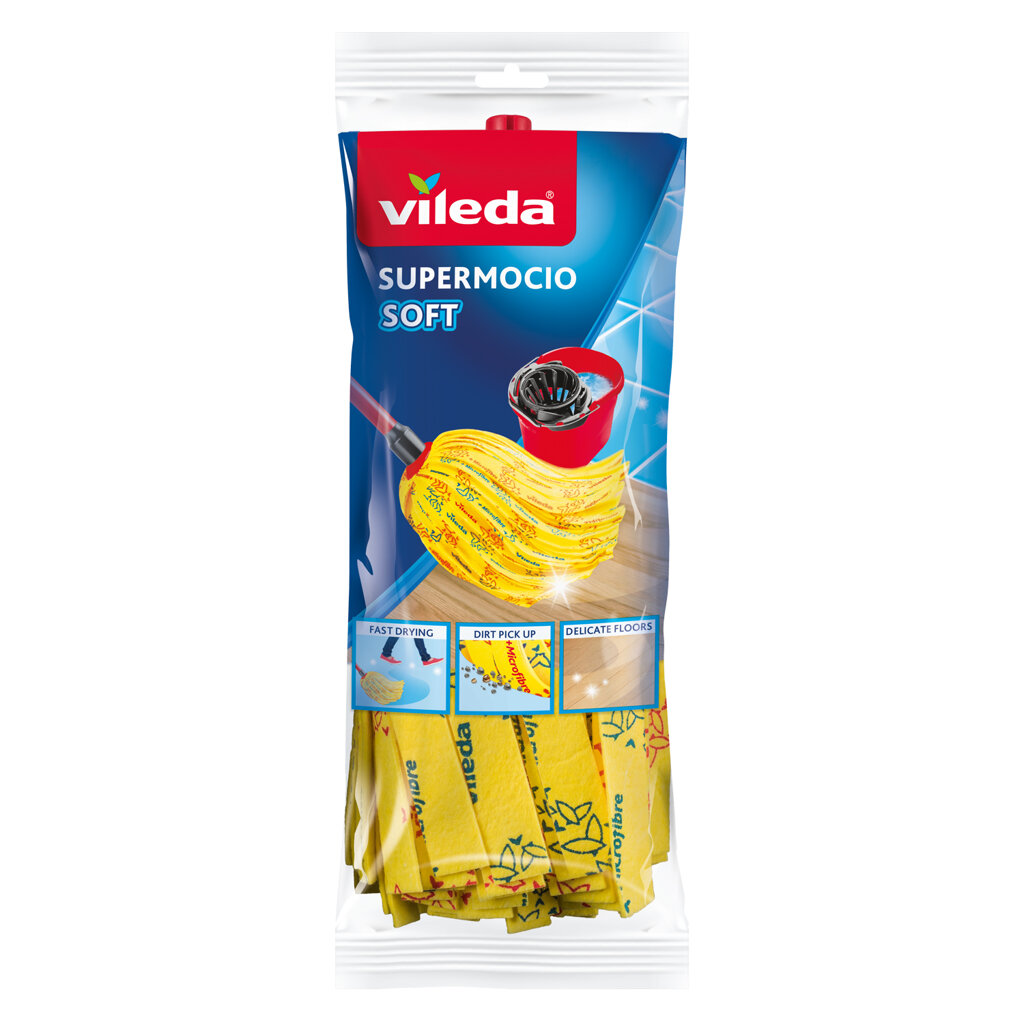 Náhradní třásňovou hlavici Vileda SuperMocio Soft lze použít na úklid všech typů tvrdých podlah. Jemně čistí nejen dlaždice, ale i citlivé podlahy a díky vysoce absorpční schopnosti podlaha rychle uschne do dokonalé čistoty bez nežádoucích šmouh. Díky unikátnímu designu hlavice je snadné dosáhnout a bez námahy vyčistit i skryté nebo obtížně dostupné oblasti včetně rohů. Žluté netkané třásně dokáží zachytit hrubé nečistoty, vlasy, drobné částečky a dokonce i ty nejjemnější prachové částice. Speciální vlákna obsahují o 30 % více mikrovláken, která pohlcují mastnotu bez chemických prostředků. Díky tomu je čištění podlah ještě jednodušší a rychlejší.