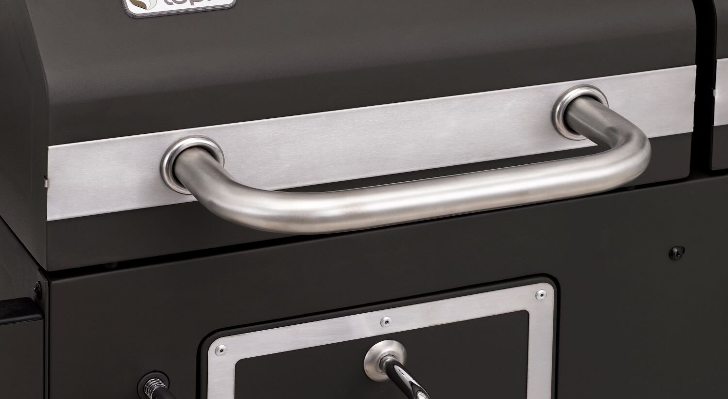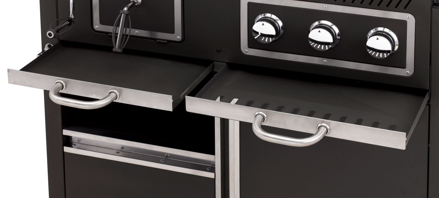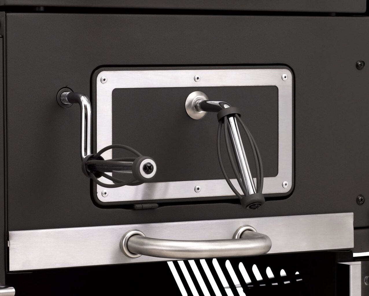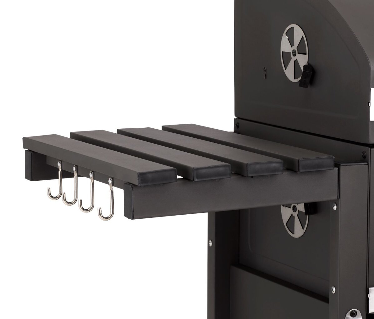 Část na dřevěné uhlí se vyznačuje snadno výškově nastavitelnou hladinou dřevěného uhlí. Jednoduché zvedací zařízení umožňuje optimální kontrolu teploty grilování. Teplota pokrmu se mění podle toho, jak daleko jsou uhlíky od grilovacího roštu. Pomocí integrovaného teploměru na víku může kuchař grilu snadno sledovat teplotu v grilu a přesně odhadnout, kdy je potřeba přidat další palivo přes klapku na dřevěné uhlí.