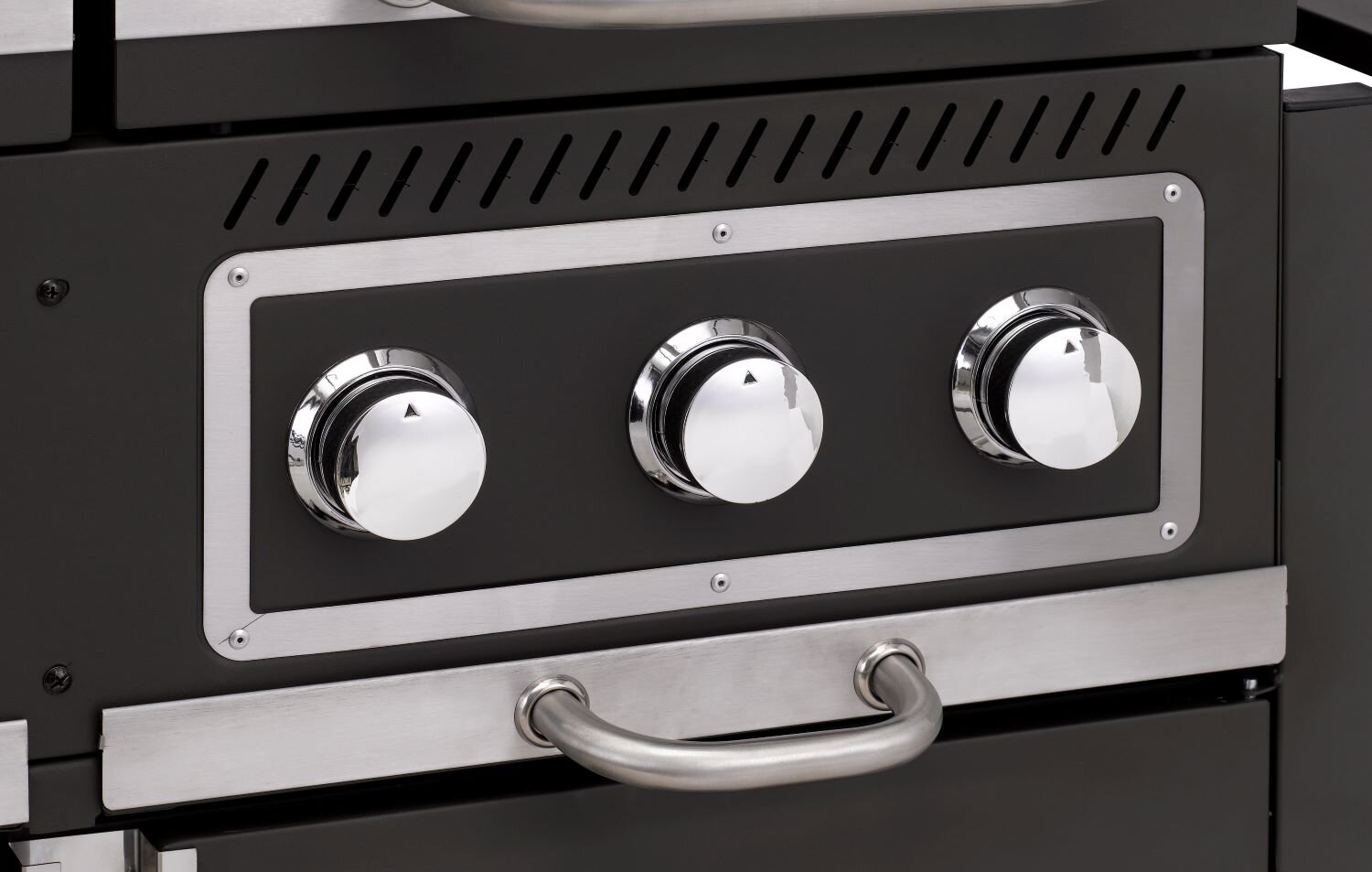 Plynový gril zaujme možností uložení plynové láhve do spodní skříňky i během používání. Kromě této výhody zaujme dalšími typickými vlastnostmi plynového grilu. Díky snadno nastavitelnému teplu je gril během okamžiku připraven k použití. Optimálního výsledku lze dosáhnout s každým grilovaným pokrmem, protože tři hořáky plynového grilu lze regulovat samostatně. Pomocí integrovaného teploměru ve víku může kuchař snadno sledovat teplotu v grilu a regulovat přívod plynu k hořákům podle požadovaného tepla.