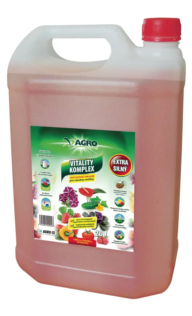 AGRO Vitality Komplex extra silný 20 l podporuje imunitu a růst rostlin, urychluje regeneraci po poškození a zlepšuje vstřebávání živin z půdy. Je ideální pro všechny oslabené a nerostoucí rostliny.