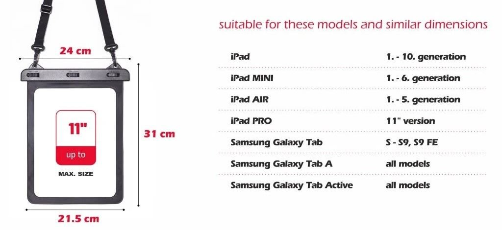Vodotěsné pouzdro od značky SWISSTEN poskytuje spolehlivou ochranu tabletu před vodou, vlhkostí i nečistotami. Vhodné pro tablety do velikosti 11" a vybavené dotykovou průhlednou fólií, která umožňuje plnohodnotné ovládání i během používání pouzdra. Krytí IPX8 zajišťuje maximální vodotěsnost, díky čemuž lze pouzdro bezpečně využít při vodních sportech, výletech do přírody, rybaření nebo na kole. Pouzdro umožňuje fotografování, poslech hudby i telefonování bez nutnosti tablet vyjmout. Rozměry: 310 × 243 mm.