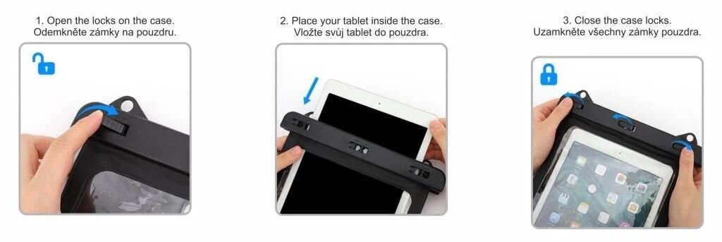 Vodotěsné pouzdro Swissten chrání tablet do velikosti 11" před vodou a vlhkostí. Umožňuje ovládání, fotografování i telefonování bez nutnosti zařízení vyjmout.